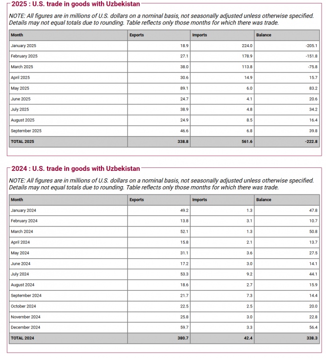 У період з лютого по вересень 2024 року США експортували до Узбекистану товарів на $223,6 млн. Еквівалентна цифра за часів Трампа у 2025 році становила $319,9 млн. Це майже 50-відсотковий стрибок за дуже короткий проміжок часу.