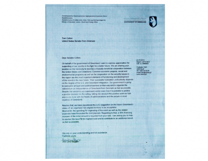 Незабаром після цього в Інтернеті з’явився лист на ім’я сенатора Коттона від 23 жовтня 2019 року, який, як стверджувалося, був написаний міністеркою освіти, культури, церкви та закордонних справ Гренландії Ане Лоне Баггер. Лист, здавалося, давав “зелене світло” американській інтервенції в Гренландії або, принаймні, запрошував до подальшого обговорення.