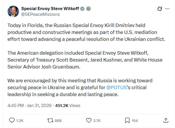 З цього можна зробити два висновки: США продовжують надавати прикриття путіну, який вбиває українців. Українці розуміють, що США ними маніпулюють, вони не сподіваються, що адміністрація Трампа забезпечить їм справедливу угоду, і що під наглядом адміністрації Трампа не відбувається “багато хороших речей”. Однак, підтримуючи цю фікцію, адміністрація відкидає будь-які спроби ввести санкції проти росії і допомагає відмовити європейців від більш рішучих дій на підтримку України. На даний момент уряд США просто бреше, щоб захистити путіна, який атакує українське цивільне населення. До речі, ця фікція триває і зараз. Віткофф щойно зустрівся з Кирилом Дмитрієвим у Флориді і опублікував цю позитивну заяву. За словами Віткоффа, росія “наполегливо працює” над укладенням мирної угоди.