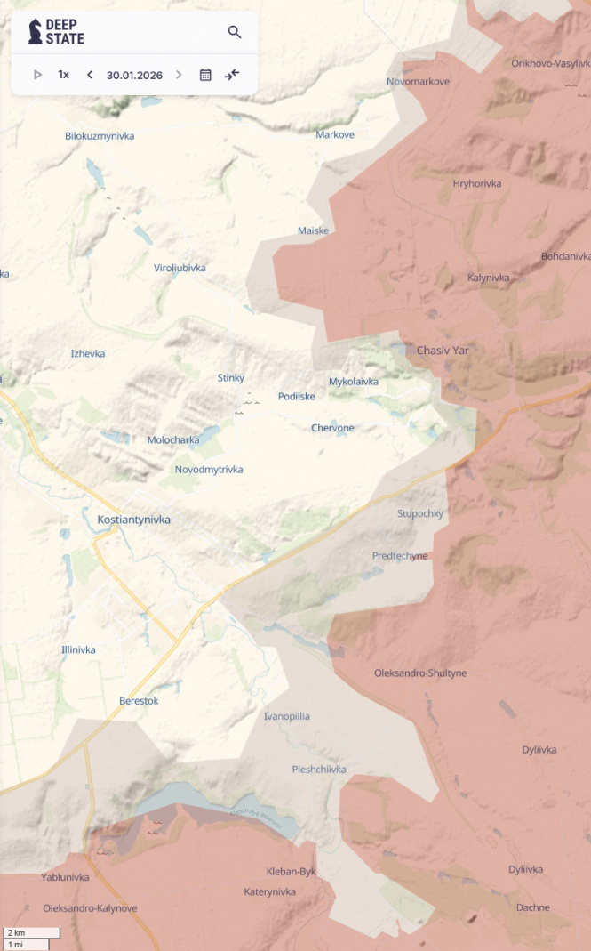 Мені особливо подобається постійне згадування про Часів Яр у верхній частині. Ця битва триває вже два роки. Однак увага до неї зменшилася, оскільки російське просування в основному зупинилося, і замість цього журналісти та аналітики говорять про Покровськ і Куп’янськ, оскільки в цих місцях спостерігається дещо більше руху. Однак погляньте на Часів Яр. Після двох років атак і незліченних втрат росіяни все ще не захопили все місто. Щоб підкреслити це, ось карта лінії фронту навколо Часового Яру на сьогодні (з точністю до 2 кілометрів).