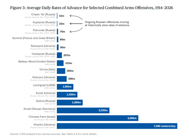 російські здобутки: Далі у звіті наголошується, що такі втрати були понесені заради шокуюче малих здобутків (з використанням дуже ефективних графіків). росіяни не тільки мало чого досягли з кінця 2022 року, але й їхній коефіцієнт втрат до просування досяг рівня, який, мабуть, є найгіршим у сучасній військовій історії. Це погано порівнюється, наприклад, з британськими успіхами під час битви на Соммі, які часто описуються в історії як жахливі втрати в боях за завойовану землю. Ось одна діаграма, яка показує, наскільки незначними були російські успіхи в Україні в історичному плані (зверніть увагу, як із продовженням війни успіхи стають все меншими й меншими в відносному вимірі).