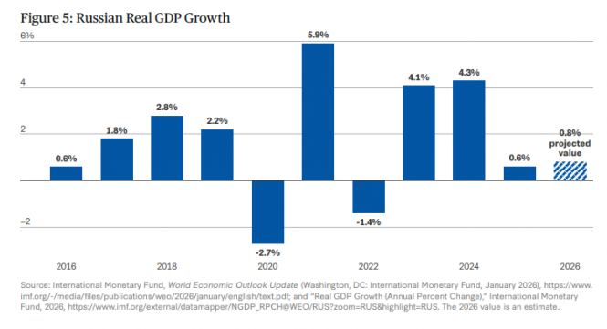 Економічна сила росії: Обговоривши високі втрати росії та незначні здобутки, звіт переходить до одного з факторів такого невдалого результату – слабкості російської економіки. Коротко кажучи, російська економіка просто не настільки сильна і ледве витримує витрати на ведення війни. Вона витрачає свої грошові резерви, її зростання стагнує, і вона не є конкурентоспроможною у сфері високих технологій. Один з графіків показує, що після початкового стрімкого зростання економіки, спричиненого величезними витратами відразу після повномасштабного вторгнення (що було цілком передбачувано), російське зростання сильно сповільнилося (що було непередбачувано).