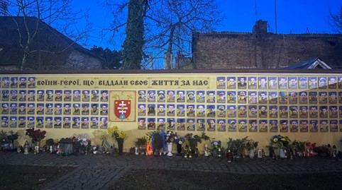 На цій стіні, на цій площі, навпроти цієї церкви, на цьому пагорбі розміщено двісті шістнадцять меморіальних дощок із фотографіями чоловіків і жінок з Ужгорода, які загинули в боях після повномасштабного вторгнення росії в Україну. Ми можемо поділити це число на чотири роки війни: у середньому п’ятдесят чотири на рік, приблизно один на тиждень. Ми можемо поділити це число на кількість населення міста і побачити, що приблизно один із п’ятисот його мешканців загинув під час служби. Це узгоджується з оцінкою, що загалом близько 100 000 українських військових загинули під час повномасштабного вторгнення. Це приблизно стільки ж, скільки американських солдатів загинуло у всіх війнах США разом узятих з часів війни 1941-1945 років, – а населення США приблизно вдесятеро більше, ніж населення України.