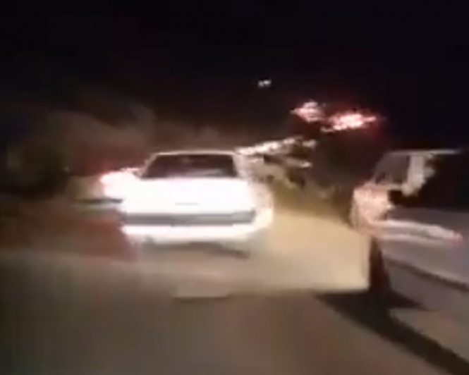 Кадр із відео, на якому видно, як іранські поліцейські виходять зі свого (цивільного) автомобіля, щоб відкрити вогонь зі штурмових гвинтівок по першому з двох HH-60W Jolly Green III, що пролітав повз.