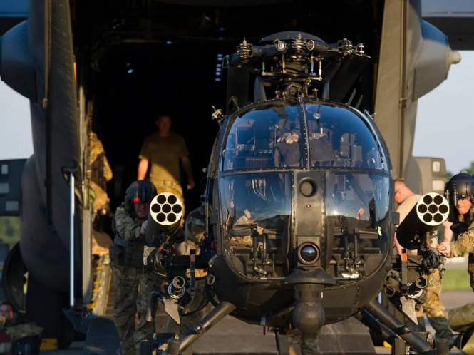 Так чи інакше, C/MC-130 швидко приземлилися там, екіпажі розвантажили MH-6, зібрали їхні гвинти й приступили до дії. Можливо, кожен транспортник перевозив по два MH-6, і можливо, один або два MH-6 виконували роль ударних машин (конфігурація, видима на фото вище, включно з мініганами та некерованими ракетами), тоді як інший (або інші два) перевозив операторів DELTA. Наразі не певен: дізнаємося найближчими днями. Достеменно відомо, що і MH-6, і оператори DELTA мають відмінну підготовку, а вони самі й їхні MH-6 чудово оснащені для нічного бою.
